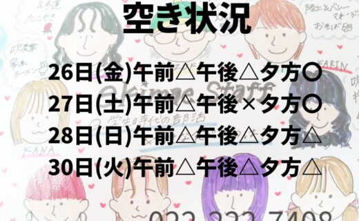 こんにちは!駅前店です。 happymerryXmas☆彡 残り4日間の空き状況をお知らせします。お電話頂けるとご希望の時間でご案内できる場合もありますのでお気軽にご連絡ください!